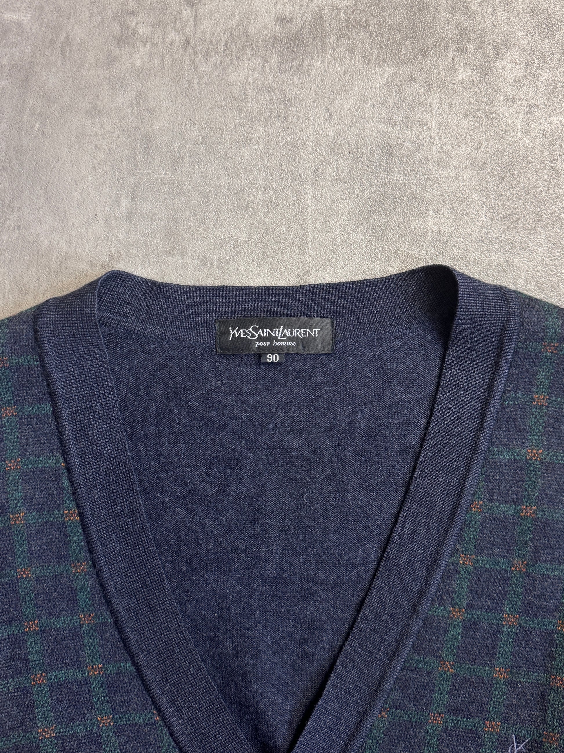 A refined Yves Saint Laurent knit that blends classic tailoring influence with relaxed knitwear ease. This plaid-patterned wool cardigan features a clean front button-down design, giving it the feel of a lightweight jacket while keeping the softness and comfort of a knit.
